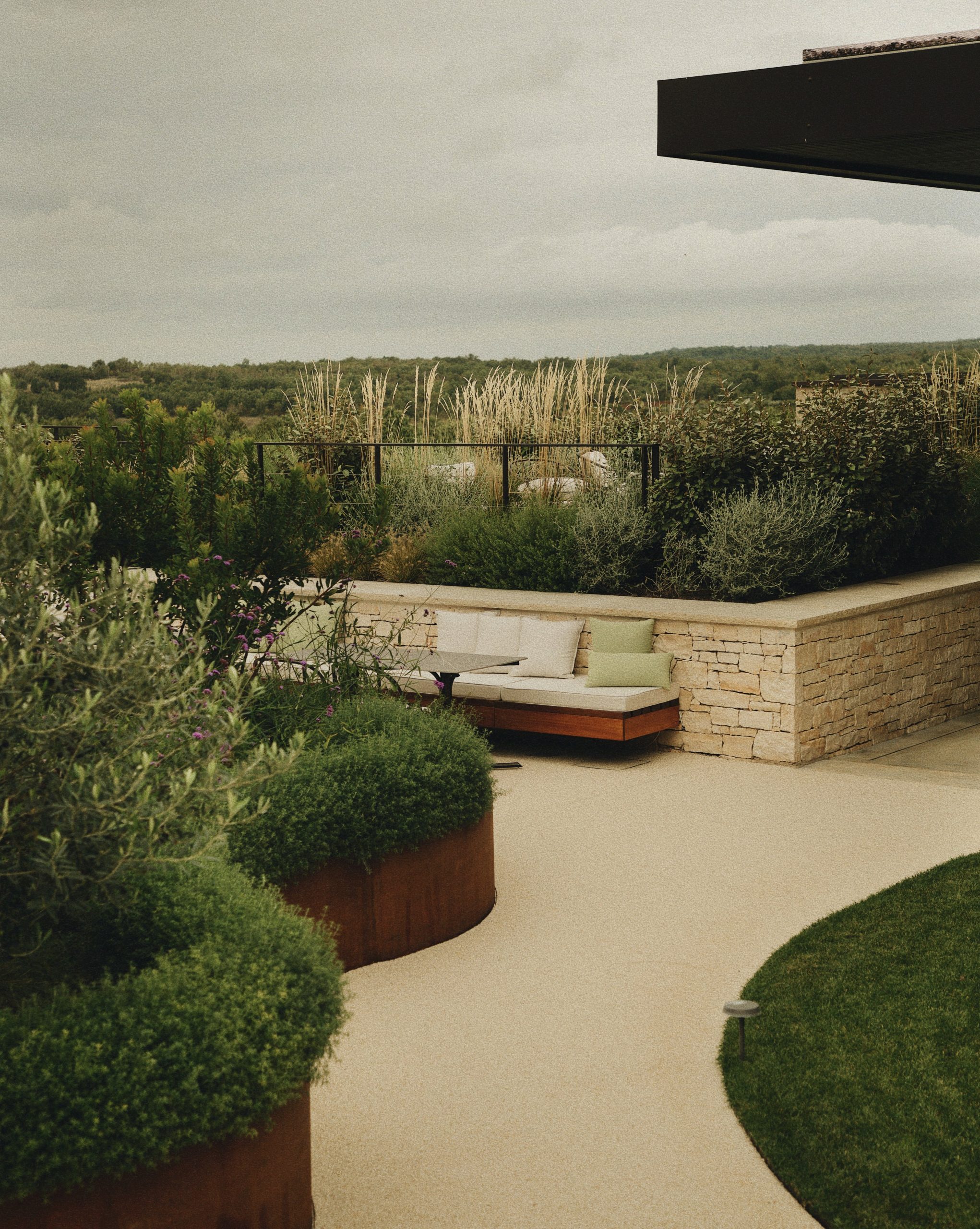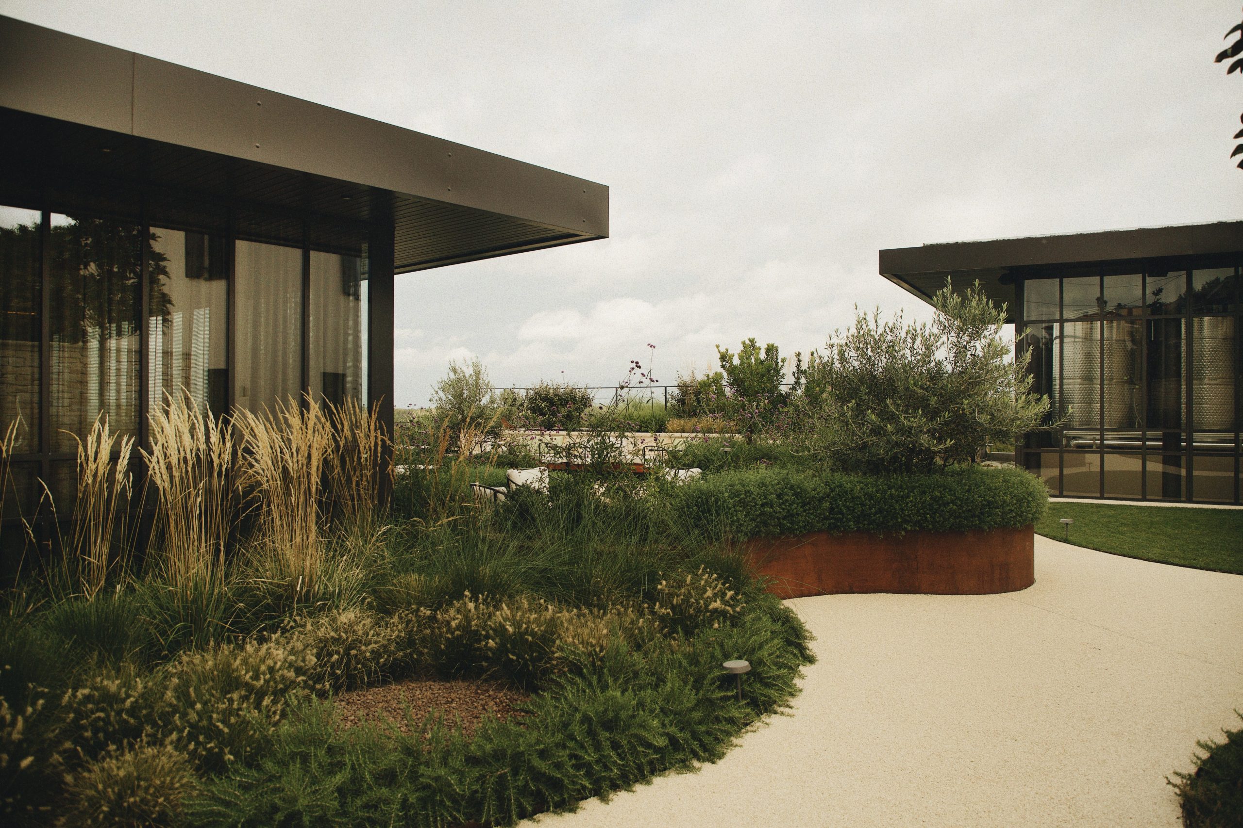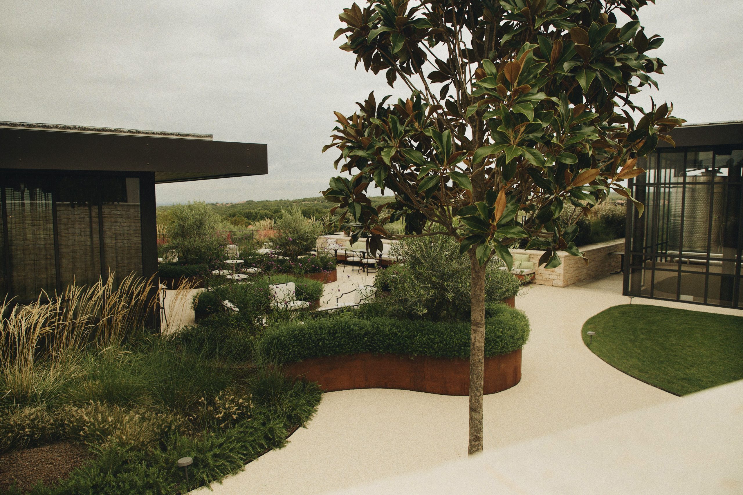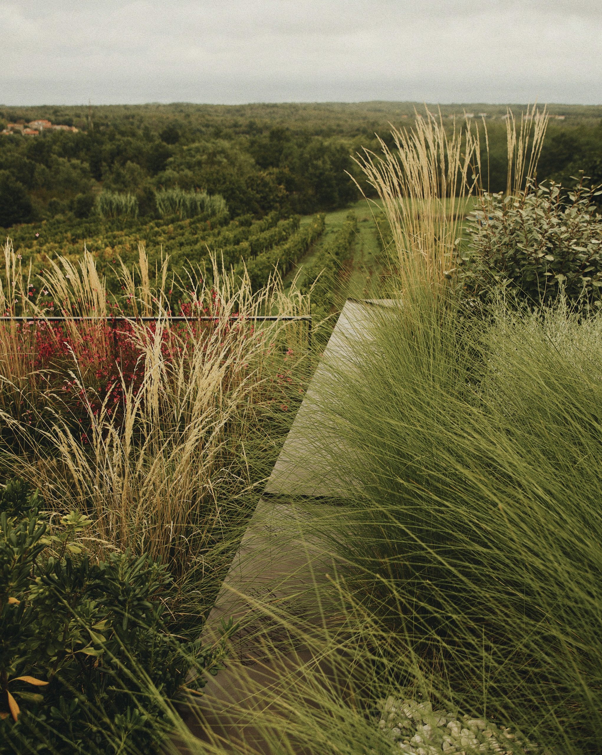 Bogato uređeni krovni vrt nad novim suvremenim proizvodnim pogonima vinarije Radovan omogućuje cjelovito iskustvo uživanja u vinima. Izdignute corten žardinjere, porozni plohe od kamenog tepih i bogata lepeza biljnog materijala stvaraju dinamičnu cjelinu.