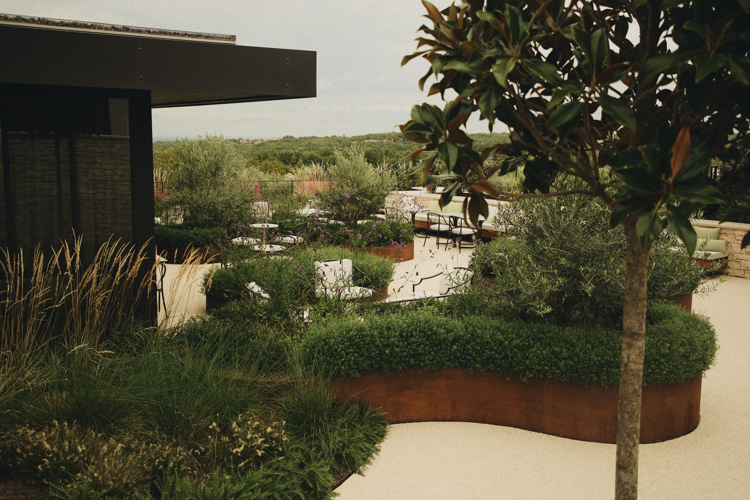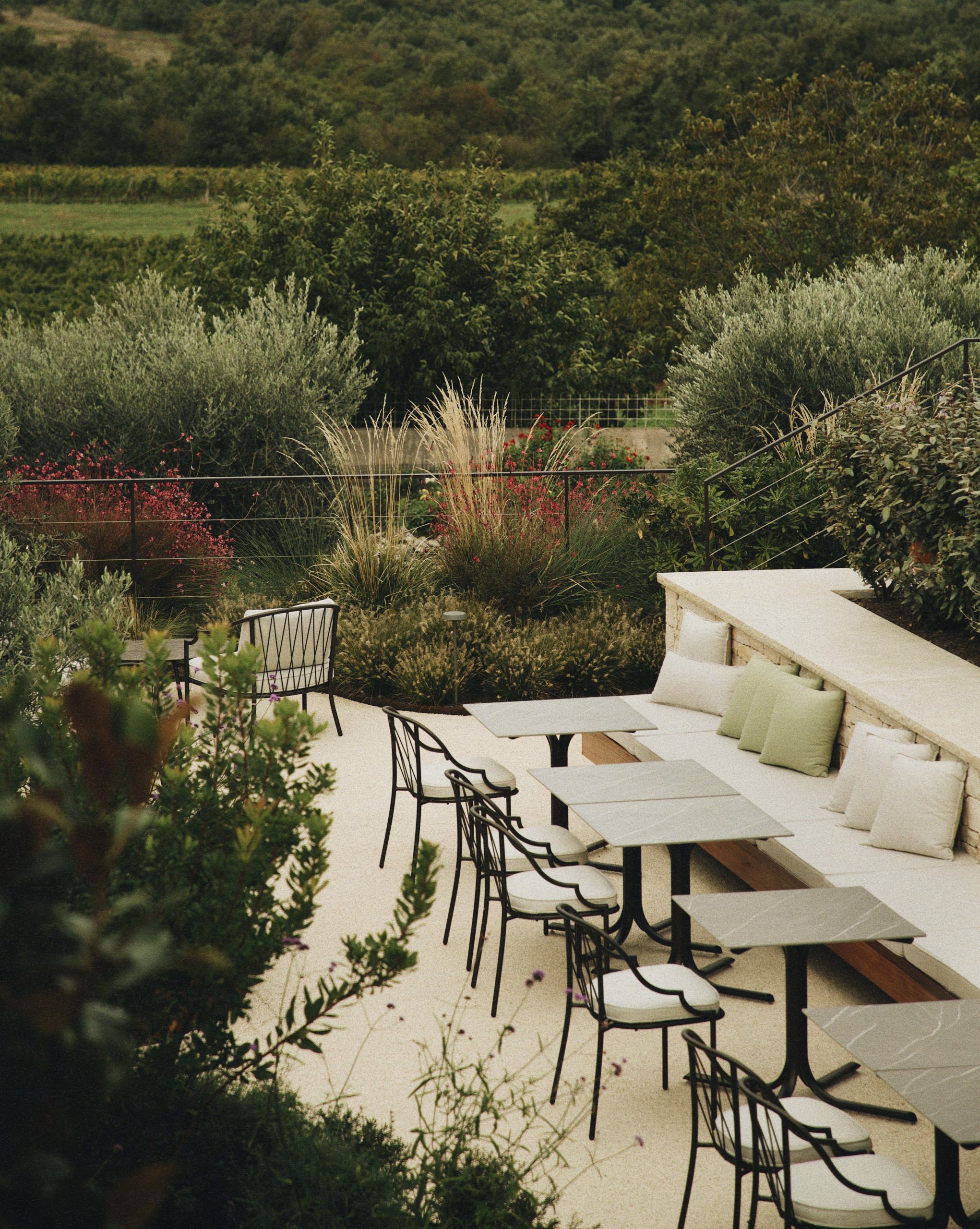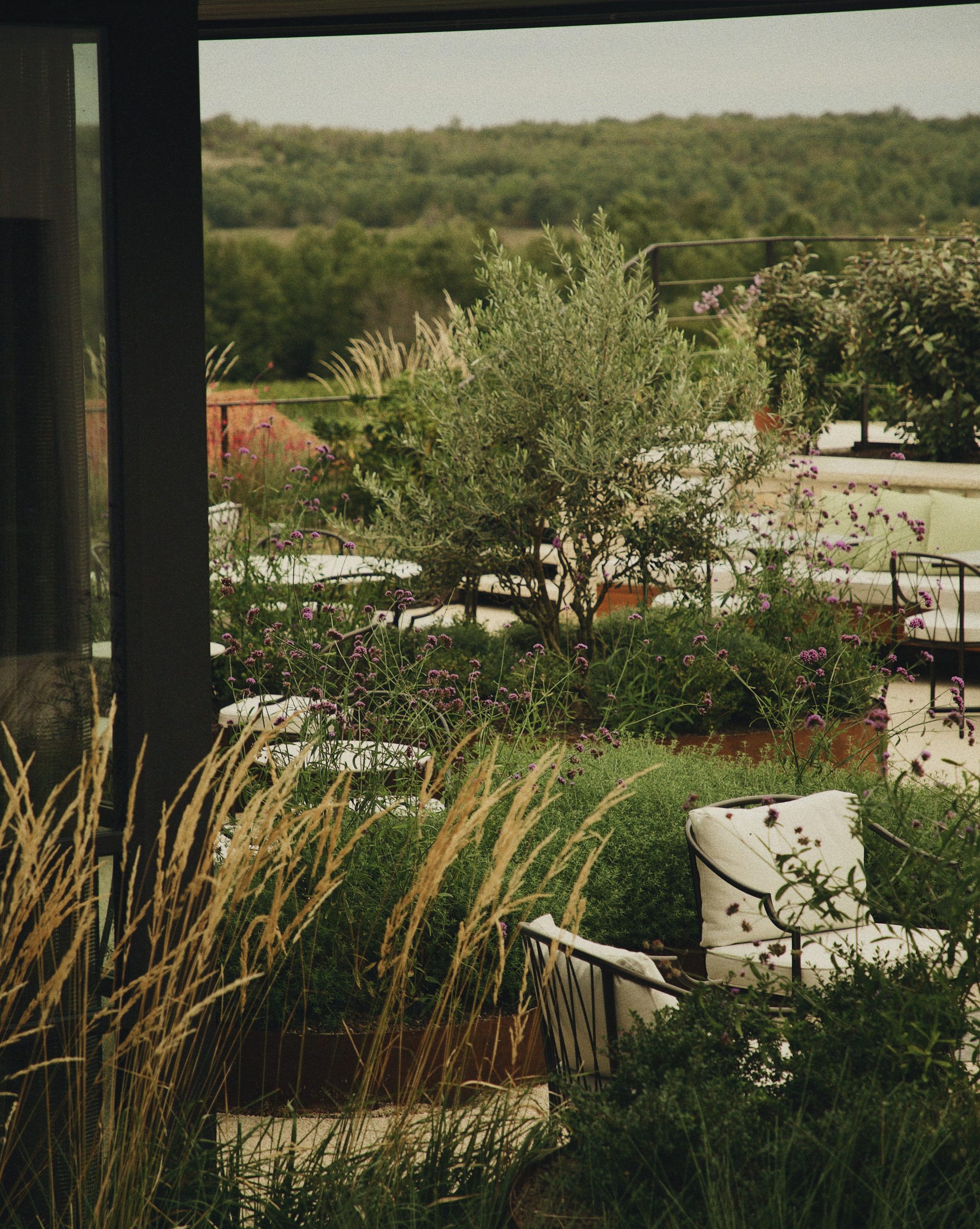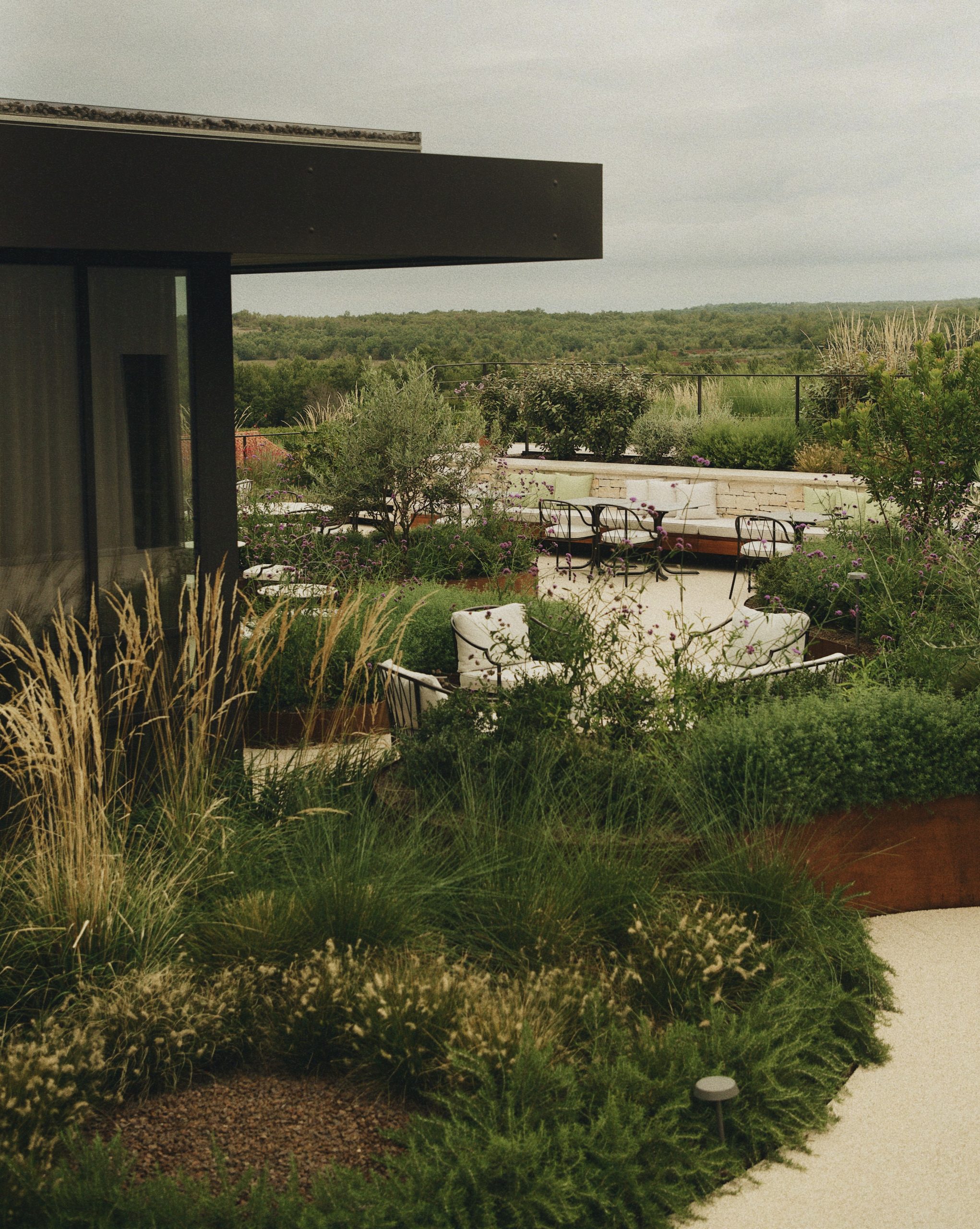 Bogato uređeni krovni vrt nad novim suvremenim proizvodnim pogonima vinarije Radovan omogućuje cjelovito iskustvo uživanja u vinima. Izdignute corten žardinjere, porozni plohe od kamenog tepih i bogata lepeza biljnog materijala stvaraju dinamičnu cjelinu.